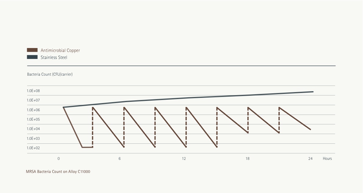 *Laboratory testing shows that, when cleaned regularly, antimicrobial copper surfaces kill greater than 99.9% of the following bacteria within 2 hours of exposure: MRSA, VRE, Staphylococcus aureus, Enterobacter aerogenes, Pseudomonas aeruginosa, and E. coli O157:H7. Antimicrobial copper surfaces are a supplement to and not a substitute for standard infection control practices and have been shown to reduce microbial contamination, but do not necessarily prevent cross contamination or infections; users must continue to follow all current infection control practices.